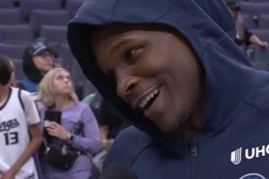 谈到本场赛后将自己的球衣送给球迷,他说:"这对我来说意义重大,因为当年KD代表雷霆来亚特兰大(爱德华兹家乡)比赛时,我也曾是看台上的小孩。我总是希望能得到一件球衣,但每次都坐在山顶位